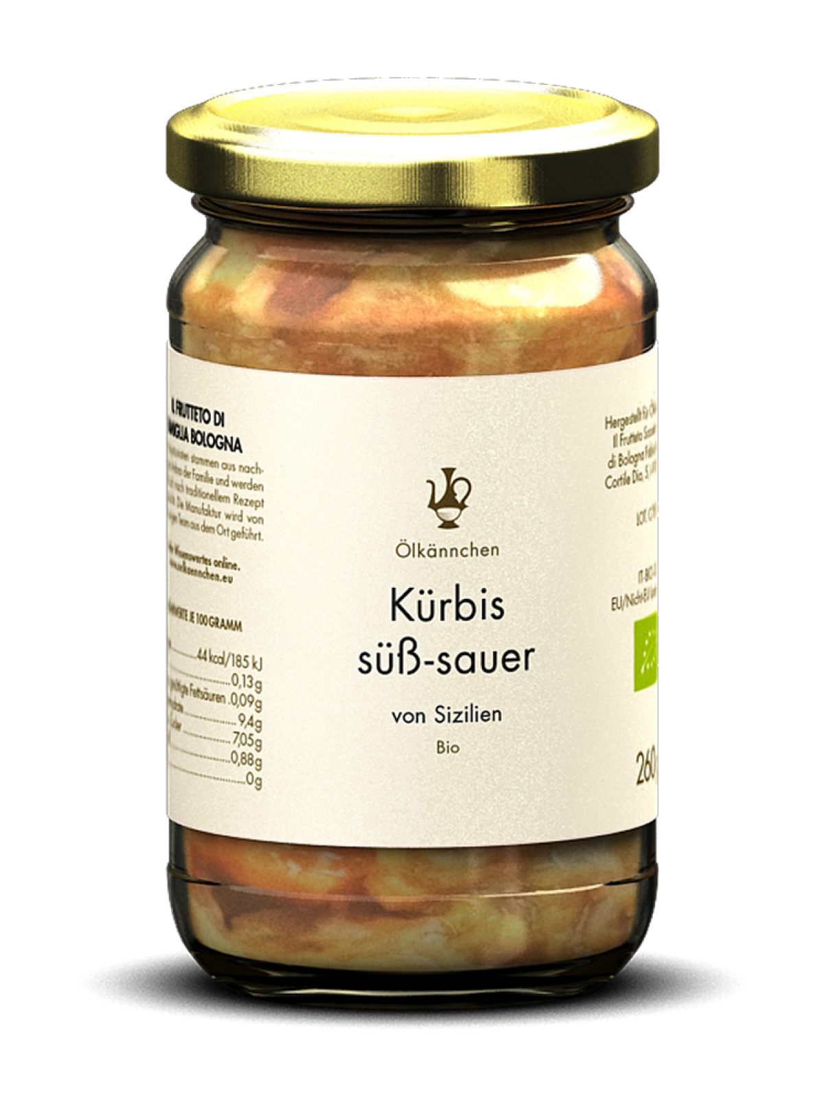 Ölkännchen Bio Kürbis süß-sauer - ein Klassiker der sizilianischen Küche. Ursprünglich stammt das Gericht Kürbis süß-sauer von einem Markt Palermos im 18ten Jahrhundert. Im Zentrum des Marktes stand damals wie heute ein Brunnen mit sieben Wasserhähnen (ugs. auf sizilianisch: cannoli). Mit Kürbis ahmten die einfachen Leuten ein Fleischgericht der Wohlhabenden nach, in welchem nicht Kürbis, sondern Leber mit süß-saurer Soße kombiniert wurde. So nennen Sizilianer das Gericht noch heute "fegato dei sette cannoli"- die Leber der sieben Wasserhähne. In einem würzigen Sud aus Zwiebeln, Zucker und Weißweinessig wird der gedünstete Kürbis mariniert. Kürbis süß-sauer schmeckt kalt und leicht erwärmt, nach Wahl auch mit gehackter Minze bestreut. Vorzüglich als pikante Beilage zu Fleischgerichten oder mit unseren anderen sizilianischen Antipasti zu geröstetem hellen Brot! Alle Hauptzutaten stammen aus eigenem, nachhaltigem Anbau der Familie Bologna und werden erntefrisch eingekocht. Die handwerkliche Verarbeitung der Bio-Delikatesse erfolgt nach Großmutters traditionellem Rezept. Il Frutteto, eine kleine ökologisch wirtschaftende Manufaktur in