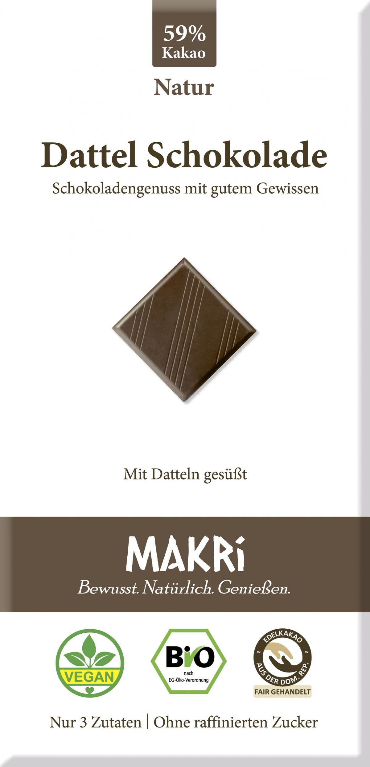 Die MAKRi Natur 59% offenbart, besonders für Liebhaber von natürlichem Schokoladengenuss, ein außergewöhnlich süßherbes Geschmackserlebnis. Die besondere, karamellige Süße von erlesenen Deglet Nour Datteln aus Tunesien harmoniert in angenehmer Weise mit dem feinherben Edelkakao der Dominikanischen Republik.