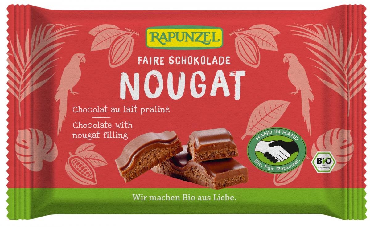 Vollmilchschokolade mit cremiger Nougat-Füllung und herrlich zarter Schmelz - fair gehandelt von Rapunzel HAND IN HAND-Partnern. Das intensive Conchieren ist neben den wertvollen Rohstoffen das eigentliche Geheimnis des wahren Schokoladengenusses. Durch die Kunst des Conchierens entwickelt sich der anfänglich noch verborgene Reichtum an kakaoeigenen Aromen Stufe um Stufe bis zur vollen Entfaltung. Gleichzeitig entsteht vollkommene Feinheit und der unvergleichlich zarte Schmelz.