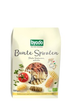 Feines Spinat- und Tomatenpulver gibt den Bunten Spiralen von Byodo die schöne Farbe. Die Nudeln aus bestem Hartweizengrieß haben einen schönen Biss.