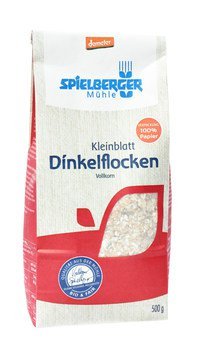 Die Dinkelflocken werden mit größter Sorgfalt in der Spielberger Flockenmühle hergestellt. Dort wird das ganze Korn zuerst zerkleinert, gedämpft und anschließend zu einer feinen Flocke gewalzt. So bleiben alle Inhaltsstoffe des vollen Getreidekorns erhalten. Bei Kleinblattflockenergibt ein Getreidekorn durch das Zerkleinern mehrere Flocken, welche feiner sind als Großblattflocken. Dinkel schmeckt fein nussig.