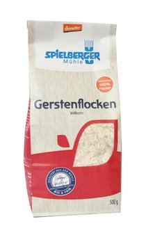 Die Gerstenflocken werden mit größter Sorgfalt in der Spielberger Flockenmühle hergestellt. Dort wird das ganze Korn gedämpft und anschließend zu einer schönen Flocke gewalzt. So bleiben alle Inhaltsstoffe des vollen Getreidekorns erhalten. Bei Großblattflocken ergibt ein Getreidekorn eine Flocke. Gerstenflocken sind besonders verträglich und schmecken mild-aromatisch.