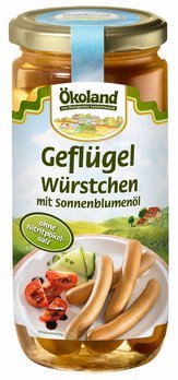 Die Ökoland Geflügel-Würstchen sind aus hochwertigem Bio-Putenfleisch hergestellt, abgerundet mit geschmackvollen Gewürzen. Sie eignen sich besonders als Einlage in Eintöpfen, zu Salaten oder pur mit Senf im Brötchen. Der natürliche Buchenholzrauch gibt den Würstchen eine herzhafte Note. Hochwertiges Bio-Fleisch bedeutet, dass unsere Bio-Bauern konsequent für eine artgerechte Haltung und gesunde Fütterung der Tiere sorgen. Glutenfrei, laktosefrei.