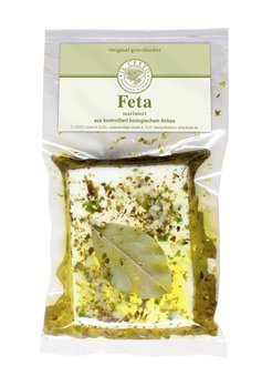 Feta g.U. (91,4%) (SCHAFSMILCH* pasteurisiert, ZIEGENMILCH* pasteurisiert [Milchsäurebakterien, mikrobielles Lab, Meersalz]), Rapsöl* (7,5%) (kaltgepresst), Knoblauch*, Petersilie*, Oregano*, Lorbeer*