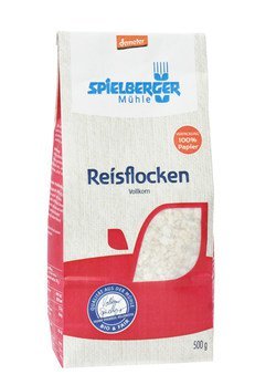 Die Reisflocken werden mit größter Sorgfalt in der Spielberger Flockenmühle hergestellt. Dort wird das ganze Korn gedämpft und anschließend zu einer schönen Flocke gewalzt. So bleiben alle Inhaltsstoffe des vollen Getreidekorns erhalten. Die sehr kernigen Flocken sorgen für eine lang anhaltende Sättigung.