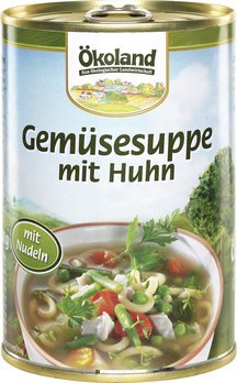 Eine schöne kräftige Gemüsesuppe mit Hühnerfleisch ist das ideale Gericht, wenn es in der Küche einmal schnell gehen muss. Die beliebte Ökoland Gemüsesuppe wird durch die verschiedenen Gemüsesorten, die Nudeln und das feine Hühnerfleisch zu einer vollwertigen und leckeren Mahlzeit. Alle Zutaten sind extra ausgewählt und so fein aufeinander abgestimmt, dass sie unserer Gemüsesuppe ihren delikaten, unverwechselbaren Geschmack verleihen.
