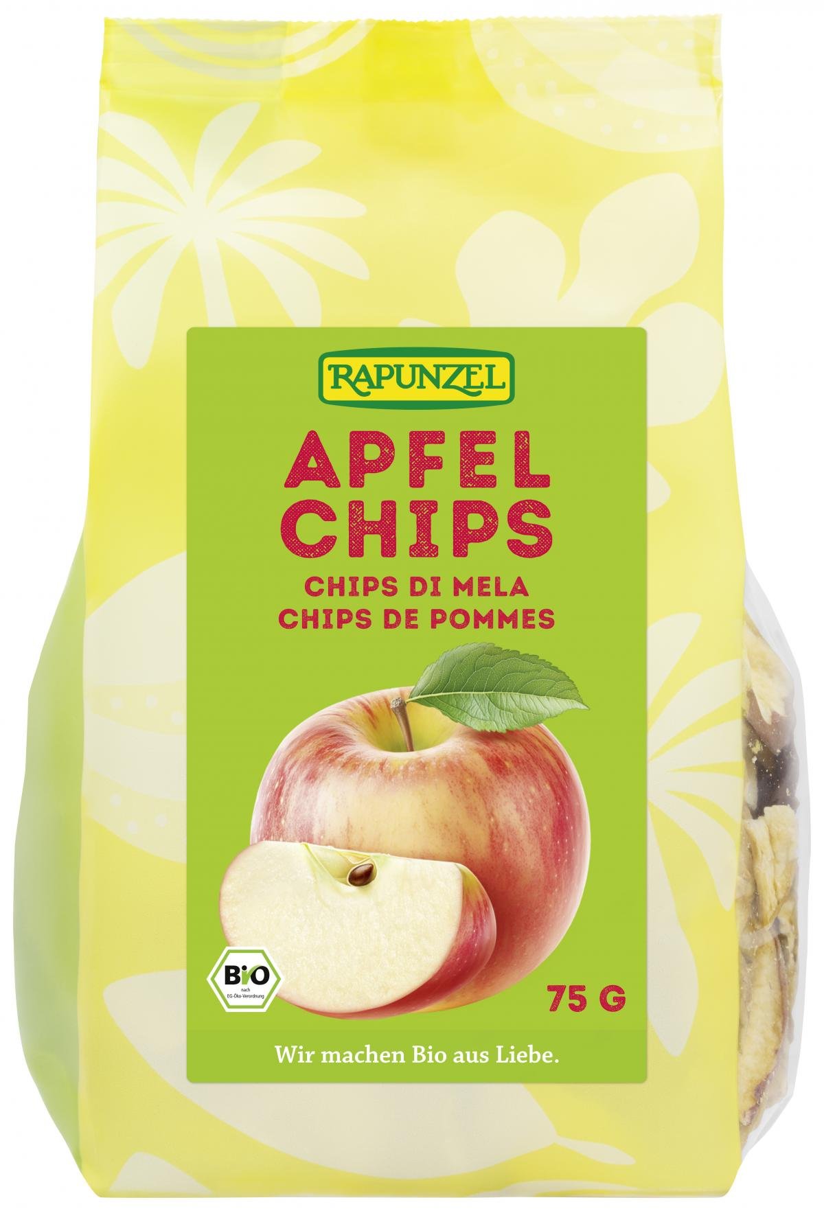 Apfel-Chips sind ein fruchtiger und krosser Knabberspaß mit süß-säuerlichem und fruchtig-frischem Apfelgeschmack. Die reifen, saftigen Äpfel werden von Hand geerntet und anschließend zu knusprigen Chips verarbeitet. Durch den Verzicht auf Zitronensäure erhalten die Chips ihre natürlich braune Färbung.