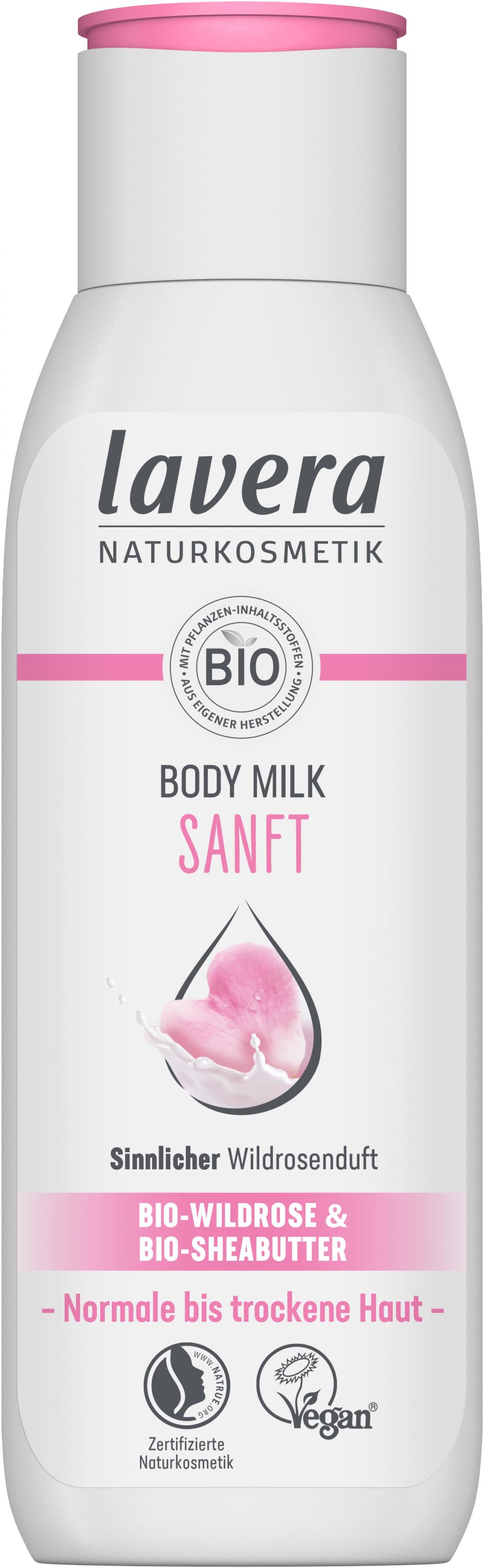 Die Body Milk Sanft mit Bio-Wildrose & Bio-Sheabutter für normale bis trockene Haut.