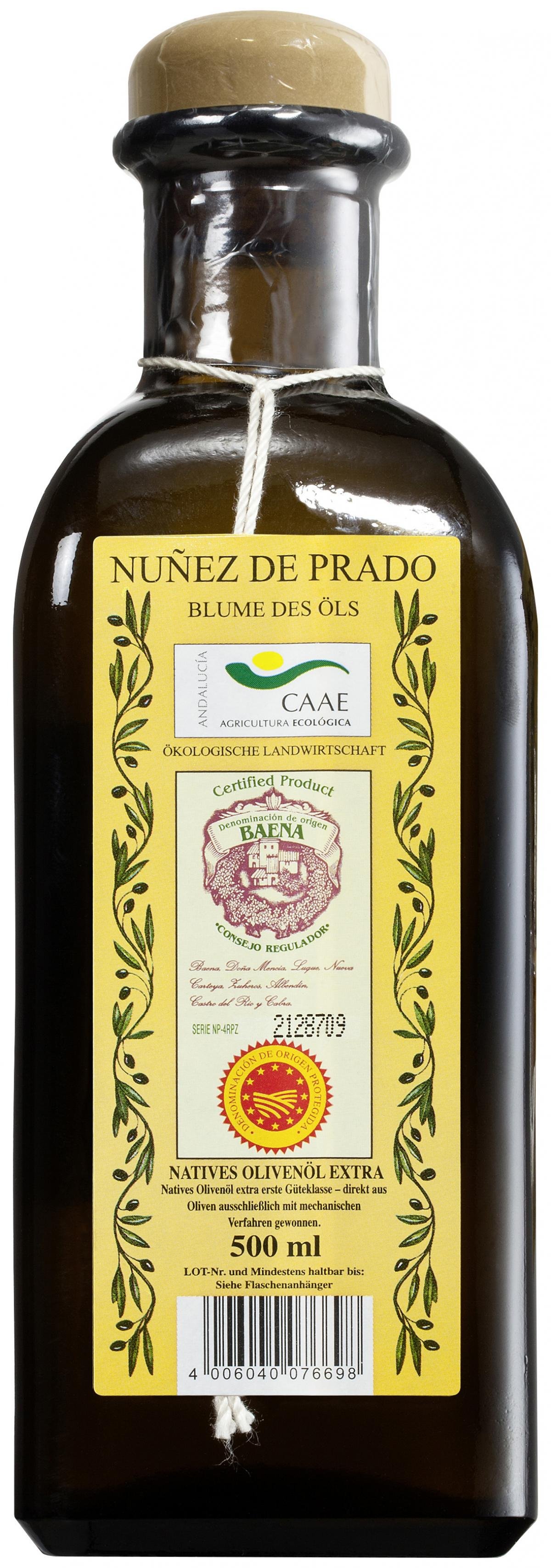 Dieses wertvolle Abtropföl wird aus Oliven gewonnen, die seit Generationen von der Familie Nunez de Prado in Andalusien angebaut, von Hand gepflückt und sorgfältig ausgewählt werden. Das Besondere an diesem Öl ist, dass die Oliven zwischen Mahlsteinen vermahlen werden und es nur durch Abtropfen ohne Pressung gewonnen wird. Die geringe Menge Öl, die hierbei entsteht, wird als 'die Blume des Öls' bezeichnet. Ohne weitere Verarbeitung wird es anschließend von Hand in nummerierte Flaschen abgefüllt. Auf traditionelle Weise hergestellt, ist 'die Blume des Öls' eine Kostbarkeit und betört durch ihr volles Aroma und den Duft nach Früchten.