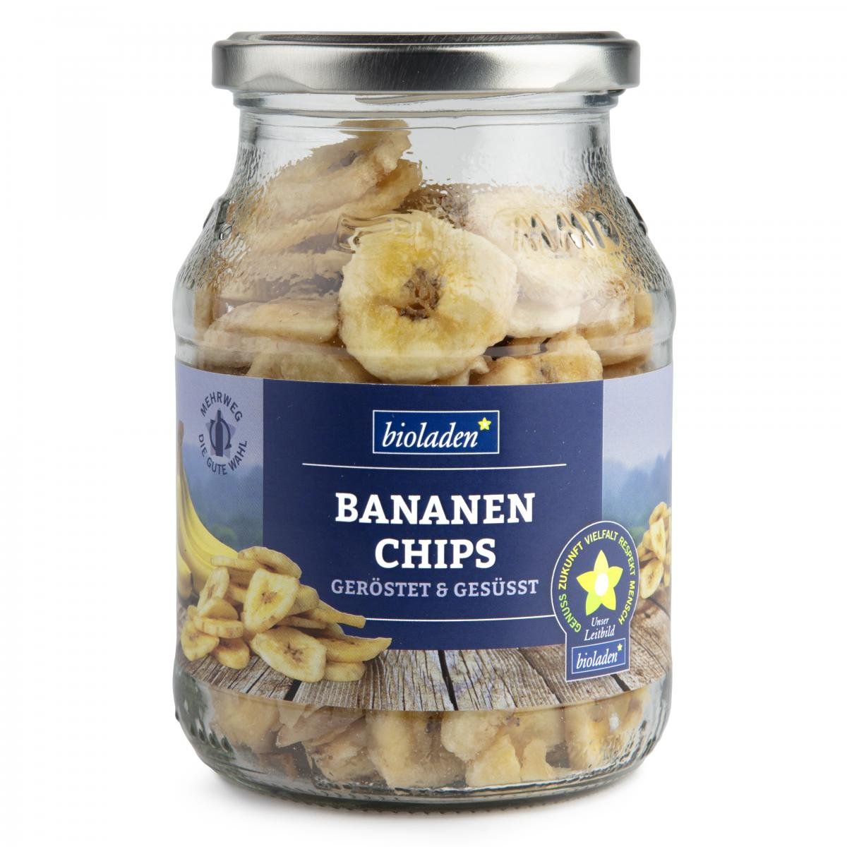 Unsere bioladen*Bananenchips sind geröstet und gesüßt. Sie eignen sich perfekt zum Naschen für zwischendurch und in Müslis. (Im Mehrwegglas.)