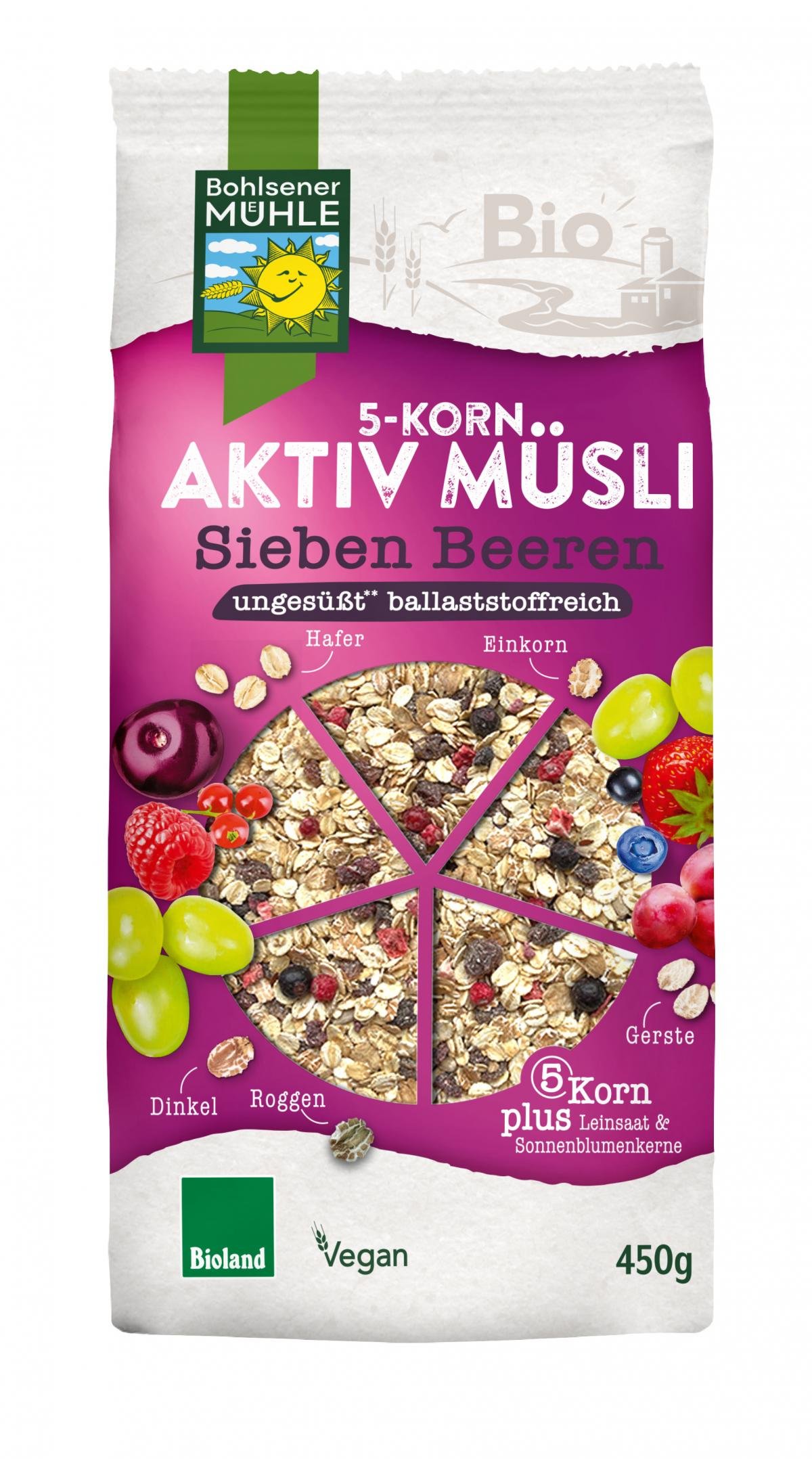 Die Kraft aus fünf wertvollen Vollkornflocken vereint im 5-Korn Aktiv Müsli. Hafer, Dinkel, Gerste, Roggen und Einkorn gemischt mit hochwertiger Leinsaat und Sonnenblumenkerne treffen auf eine aromatische Beerenvielfalt. Für eine vielseitige und ausgewogene Ernährung, um genussvoll und aktiv in den Tag zu starten.