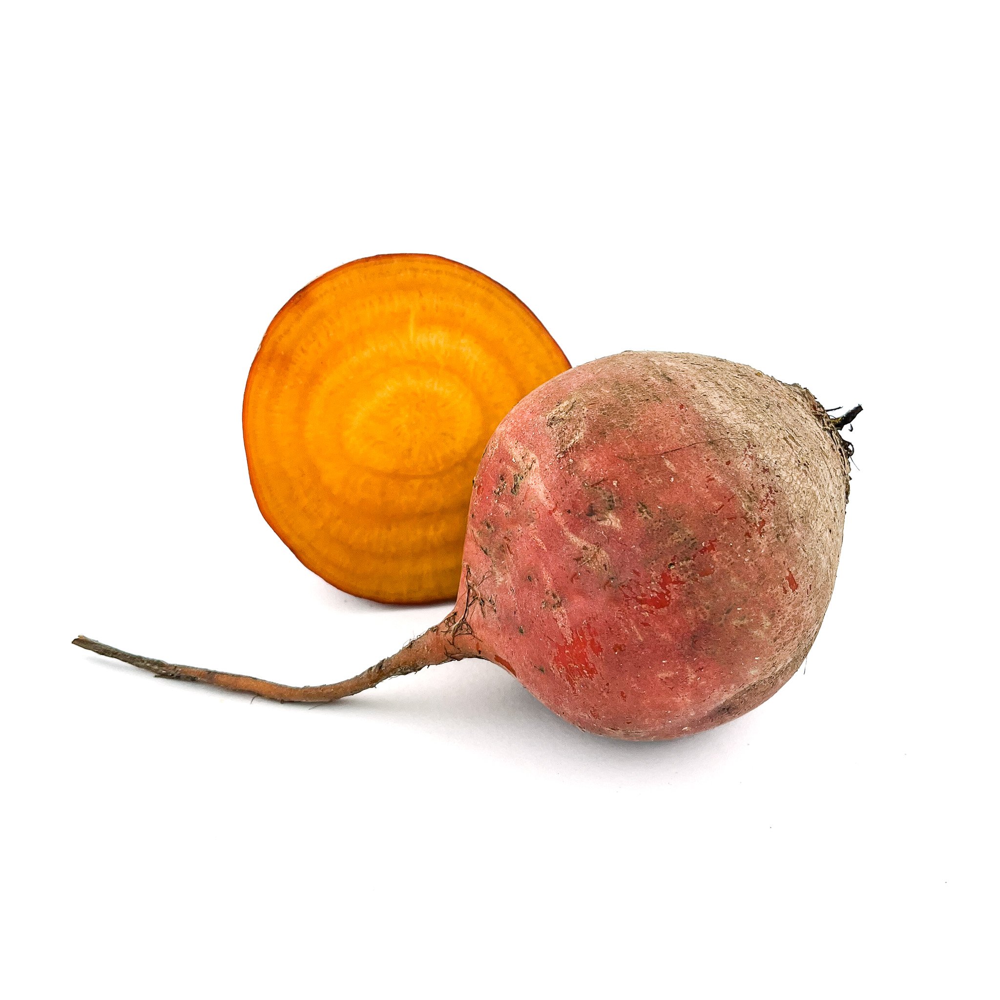 Die Gelbe Beete, auch Goldrübe genannt, ist eine besondere Variante der Roten Bete. Sie hat eine leuchtend gelbe bis orangefarbene Schale und ein goldgelbes, zart süßliches Fruchtfleisch. Ihr Geschmack ist milder und weniger erdig als der der Roten Bete.