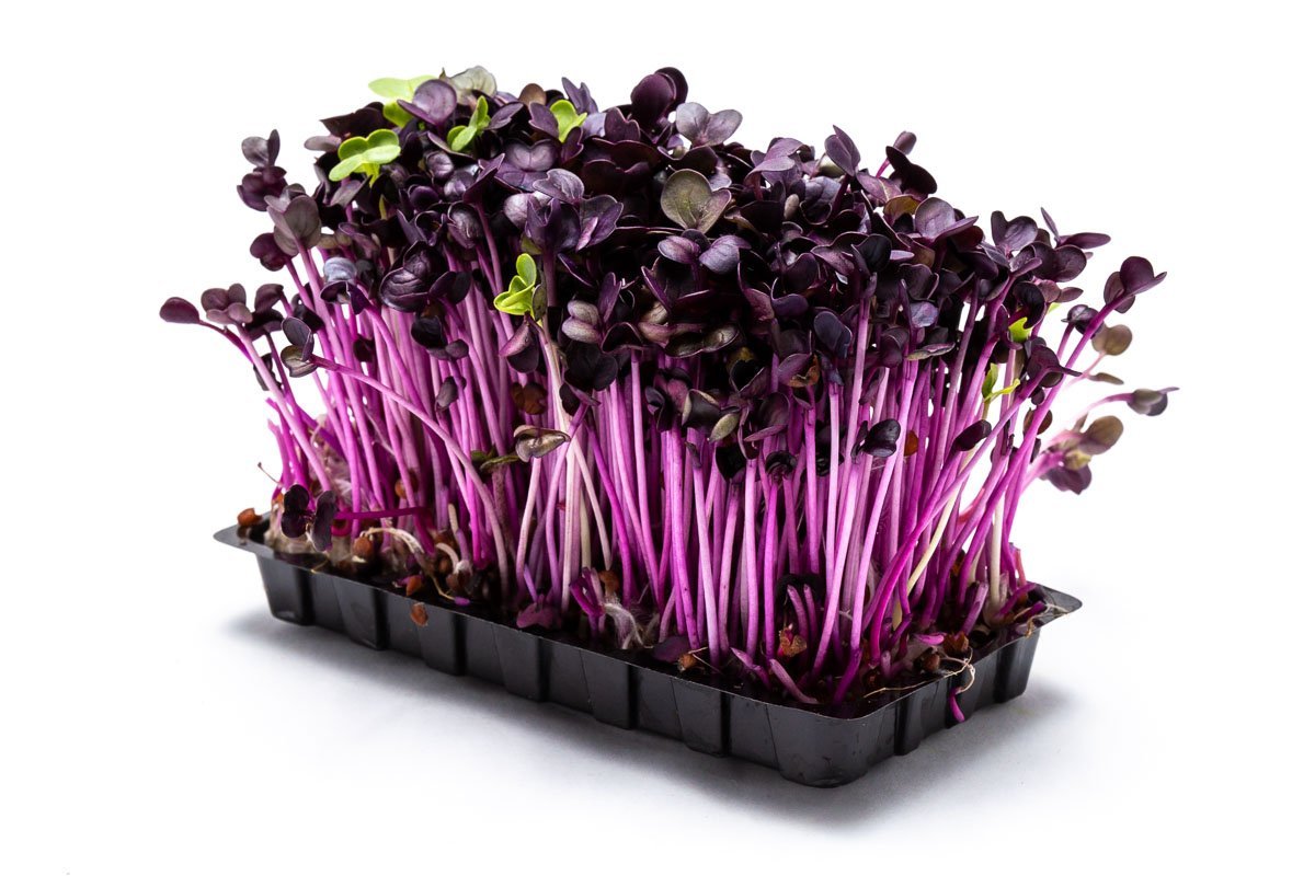 Rote Rettichkresse hat zarte, purpurfarbene Blättchen mit einem dekorativen Aussehen und einem würzig-scharfen Geschmack, der an frischen Rettich erinnert.